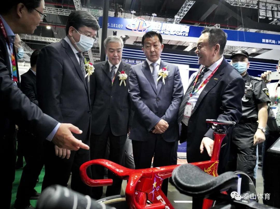 中国体育用品业联合会主席李桦、国家体育总局青少年体育司司长王立伟在6686产业集团副董事长卞青峰陪同下参观6686展厅。
