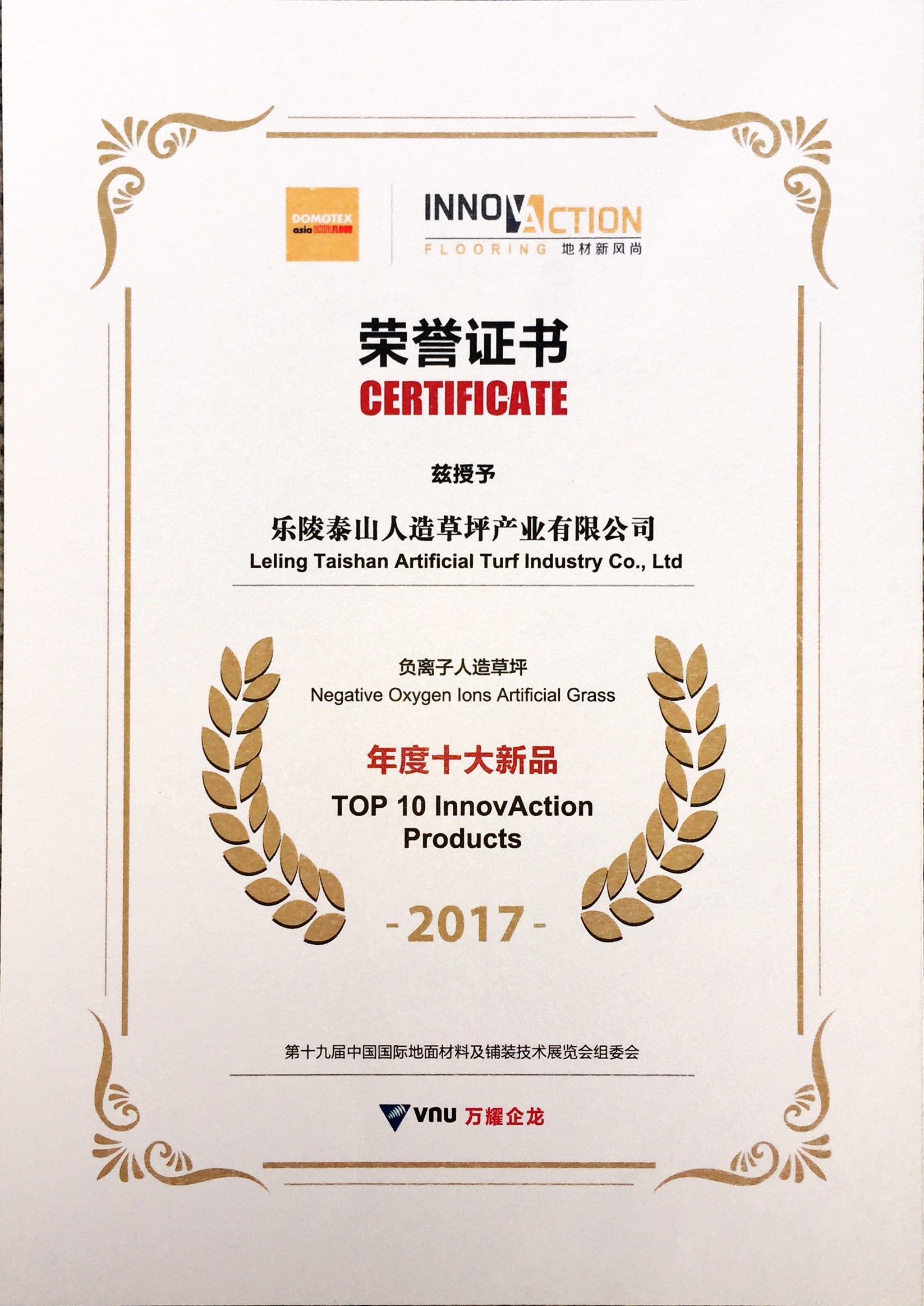 乐陵6686体育人造草坪产业有限公司负离子人造草坪年度十大新品2017