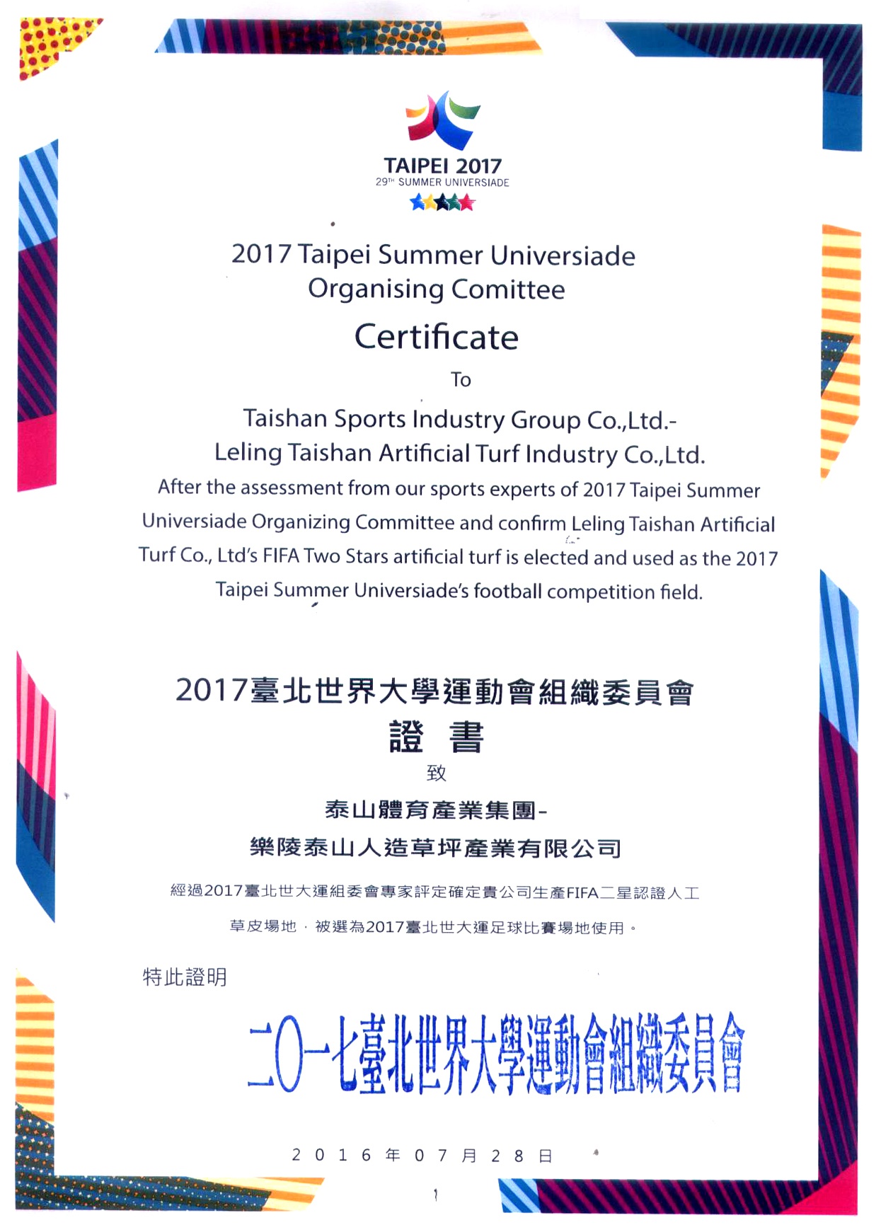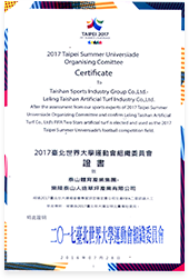 2017台北世界大学运动会组织委员会证书致乐陵6686体育人造草坪产业有限公司